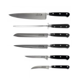 Noże wykonane są z hartowanej stali chromowo-molibdenowo-wanadowej, co zapewnia im długą żywotność i doskonałe właściwości tnące. Ostrza ostrzone pod kątem 20° gwarantują płynne i precyzyjne cięcie. Ergonomiczne rękojeści z tworzywa POM są odporne na zużycie i zapewniają stabilny chwyt.