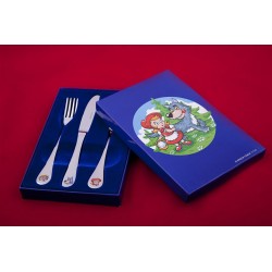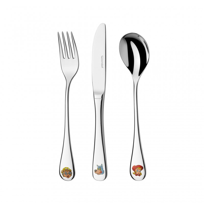 Zestaw sztućców dziecięcych „Kapturek” to idealny komplet dla najmłodszych, który umili każdy posiłek. Na łyżce, widelcu i nożu znajdują się wesołe motywy z bajki o Czerwonym Kapturku – samej bohaterki, wilka oraz babci. Kolorowa kaseta w wersji czerwonej lub niebieskiej sprawia, że zestaw świetnie nadaje się również na prezent. Wykonane z wysokiej jakości materiałów sztućce są bezpieczne dla dzieci i nadają się do mycia w zmywarce.
