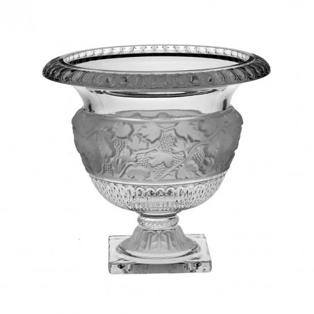 Elegancka kryształowa misa BOHEMIA ANTIQUE to połączenie klasyki i ponadczasowego stylu. Wykonana z wysokiej jakości przezroczystego kryształu, doskonale sprawdzi się jako misa na owoce, półmisek do serwowania czy dekoracyjny element wnętrza. Jej wyjątkowy design podkreśla zdobienie w formie wzoru diamentowego, uzupełnionego matowym paskiem z ornamentem przedstawiającym kiście winogron i liści. Całość osadzona jest na wysokiej, stabilnej nodze, co nadaje naczyniu lekkości i elegancji.