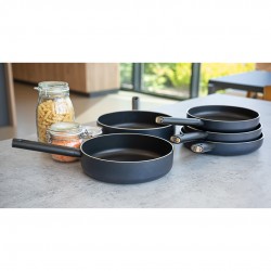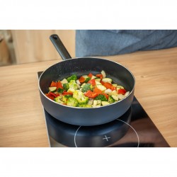 Patelnia wykonana jest z lekkiego aluminium o grubości 3 mm, które zapewnia szybkie i równomierne nagrzewanie. Głęboka forma (7 cm) sprawia, że idealnie nadaje się nie tylko do smażenia, ale także do duszenia, przygotowywania sosów czy dań jednogarnkowych. Trójwarstwowa nieprzywierająca powłoka Eclipse o odporności do 45 000 cykli ścierania umożliwia gotowanie z minimalną ilością tłuszczu i ułatwia czyszczenie.